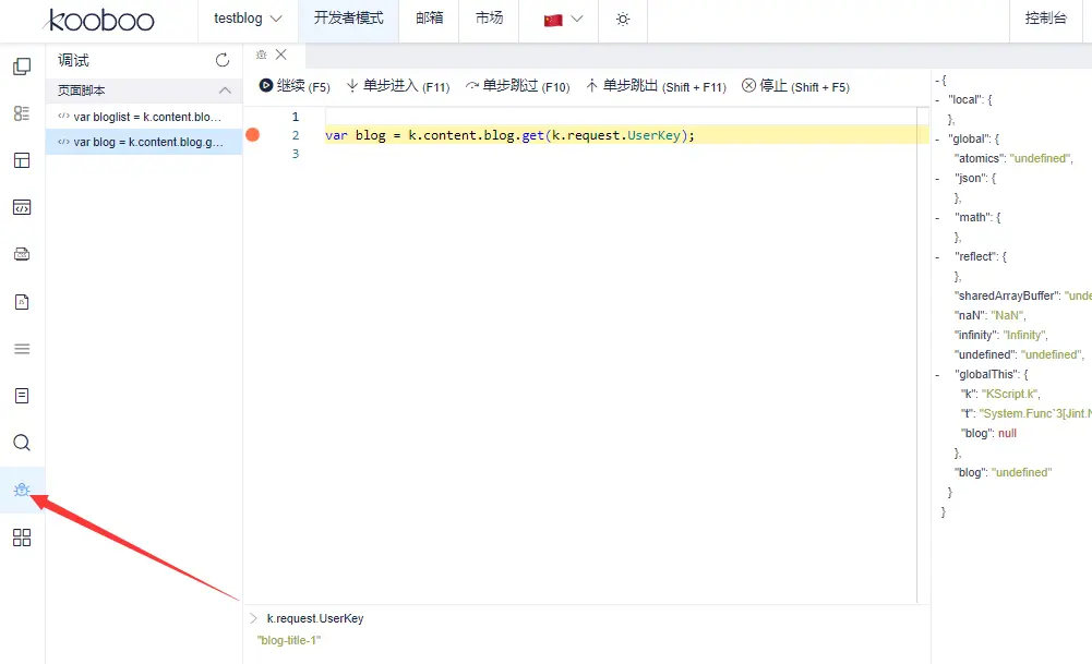 Kooboo提供在线调试功能, 进入 开发者模式, 在左边的菜单找到debug的入口, 如下图。